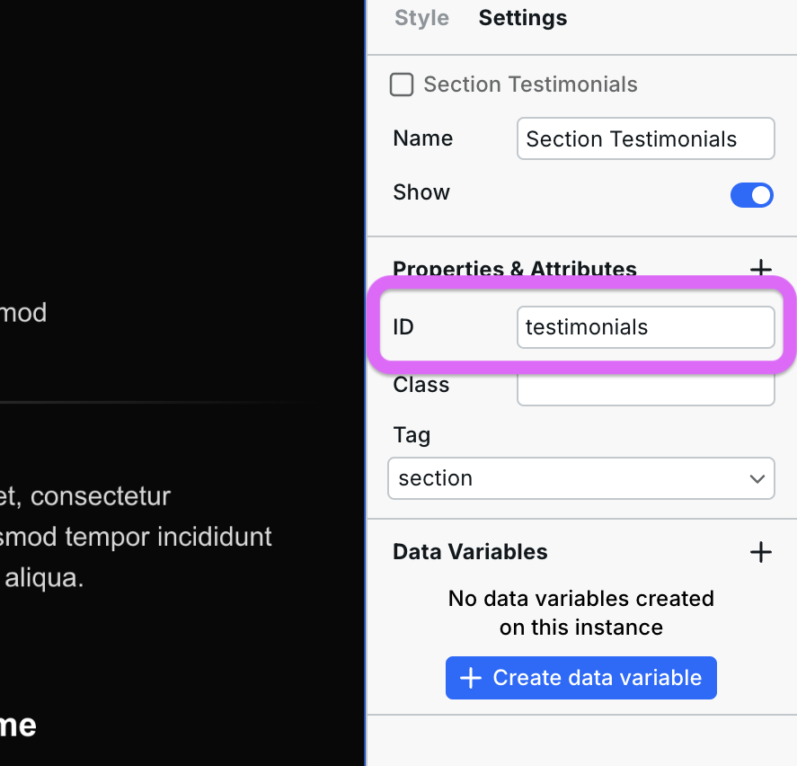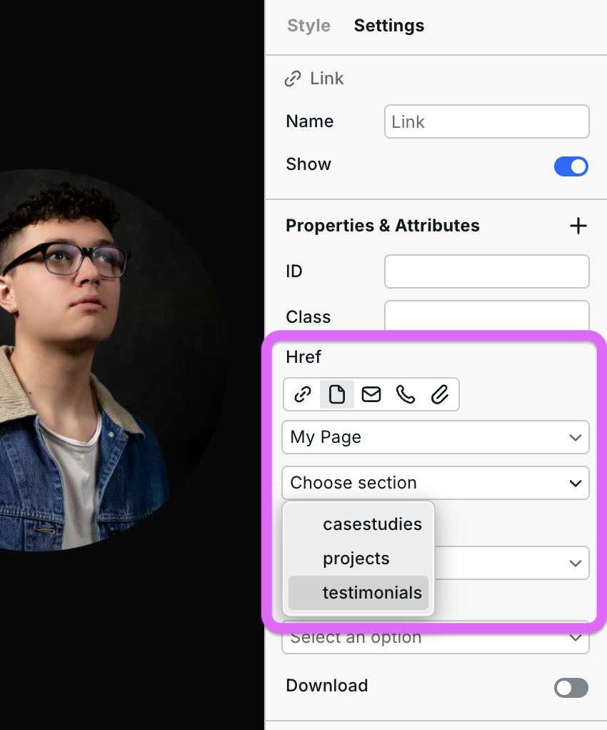 2. **Page**: You can link to all of your pages within your site here. You can also link to specific sections within those pages. To link to a section on a page, first go to the section and fill out the `ID` field in Settings. Then go back to the link, select the page, and then in the next dropdown select the `ID` you just created. Like this: