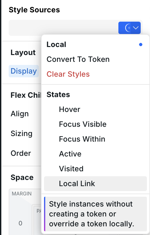 When using links for navigation and wanting to highlight the current page, the link component has a "Local Link" state in every style source.